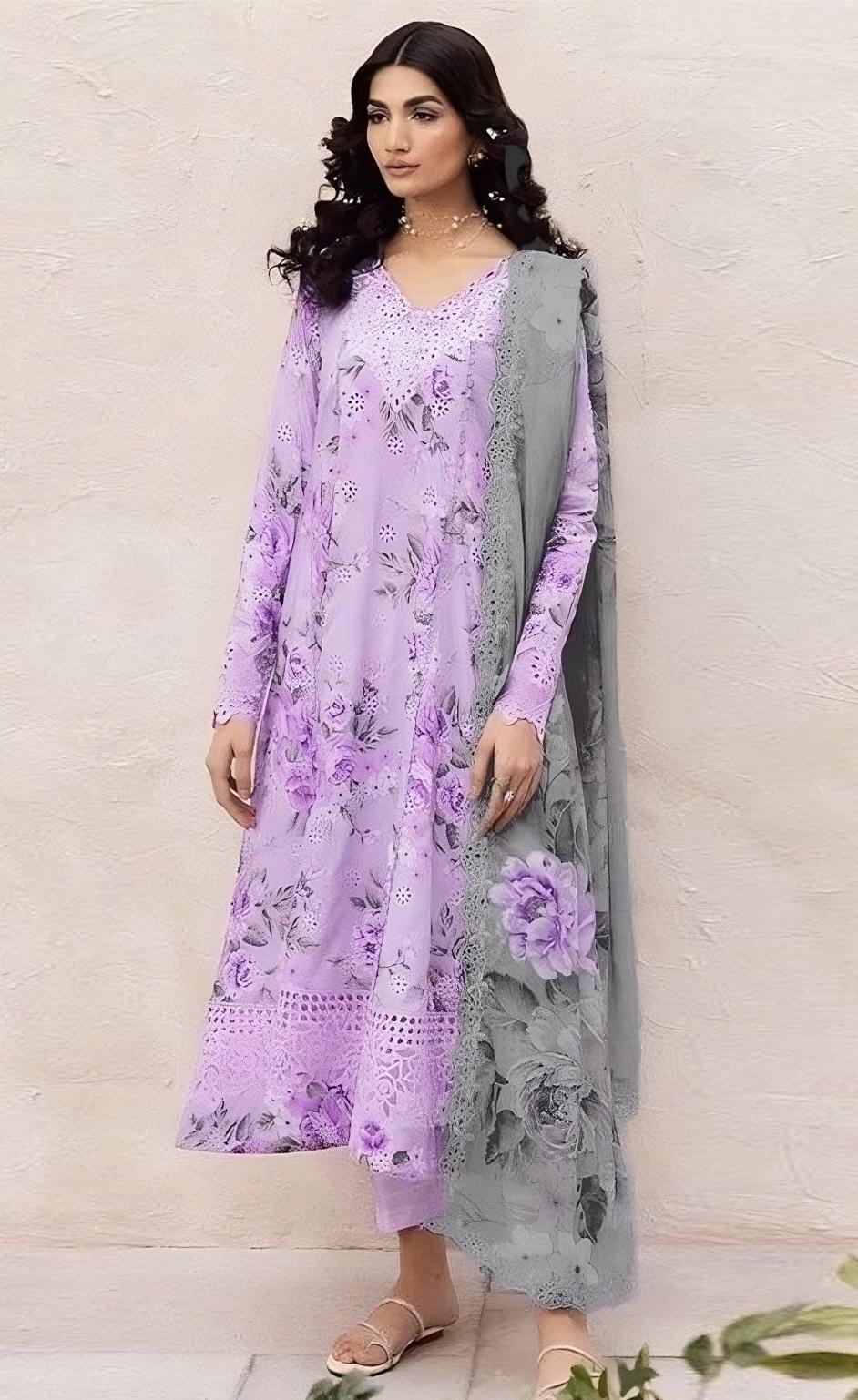 3 Piece - Iznik Printed Lawn Embroidered+ Chikenkari Suit with Printed Chiffon Duppatta (Unstitched)